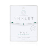 Say hello to the prettiest way to embellish your feet this season! This silver plated 'May Green Agate' Birthstone Anklet is the perfect personalised treat representing happiness and creativity with special meaning for everyone who wraps the adjustable shimmering design around their ankle.