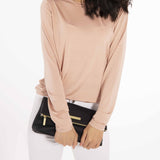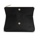 Transform your outfit with a touch of modern luxe! This stylish Alise fold-over clutch has a slouchy silhouette with a contemporary fold-over style that fastens with a popper, giving a chic yet understated look. Finished with a beautifully soft black material with a subtle pebble finish and accented with our signature golden logo hardware as well as a zip fastening, it’s the perfect day to night bag!