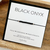 Black Onyx - FOXUS - CONFIDENCE - INNER STRENGTH This Black Onyx bracelet comes on delicate black silk cord accented with Sterling Silver or 14K gold filled beads. Black Onyx beads measure approximately 3mm The silk bracelet measures approximately 24cm and it comes with a sliding beads so that the bracelet can be removed as desired. Presented on a beautiful keepsake card printed on high quality matte white card (80mm x 80 mm) and it comes with either a black or white mini envelope. Packaged in a cellophane bag. All information about the metaphysical properties of the crystals is for reference only. It is a combination of research on how the gemstones have been used by different cultures today and throughout history. We do not recommend using crystals as a substitute for conventional medical or psychological treatment and do not claim they cure or heal medical conditions. Please always listen to the advice of your medical professional.