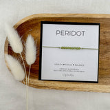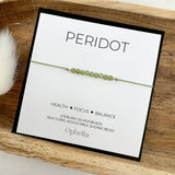 Peridot - HEALTH - FOCUS - BALANCE August Birthstone This Peridot bracelet comes on delicate jade green silk cord accented with Sterling Silver or 14K gold filled beads. Peridot beads measure approximately 3mm The silk bracelet measures approximately 24cm and it comes with a sliding beads so that the bracelet can be removed as desired. Presented on a beautiful keepsake card printed on high quality matte white card (80mm x 80 mm) and it comes with either a black or white mini envelope. Packaged in a cellophane bag. All information about the metaphysical properties of the crystals is for reference only. It is a combination of research on how the gemstones have been used by different cultures today and throughout history. We do not recommend using crystals as a substitute for conventional medical or psychological treatment and do not claim they cure or heal medical conditions. Please always listen to the advice of your medical professional.