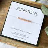 Sunstone - JOY - POSITIVE ENERGY - STRENGTH This sunstone bracelet comes on delicate silk cord accented with Sterling Silver or 14K gold filled beads. Sunstone beads measure approximately 3mm. The silk bracelet measures approximately 24cm and it comes with a sliding beads so that the bracelet can be removed as desired. Presented on a beautiful keepsake card printed on high quality matte white card (80mm x 80 mm) and it comes with either a black or white mini envelope. Packaged in a cellophane bag. All information about the metaphysical properties of the crystals is for reference only. It is a combination of research on how the gemstones have been used by different cultures today and throughout history. We do not recommend using crystals as a substitute for conventional medical or psychological treatment and do not claim they cure or heal medical conditions. Please always listen to the advice of your medical professional.